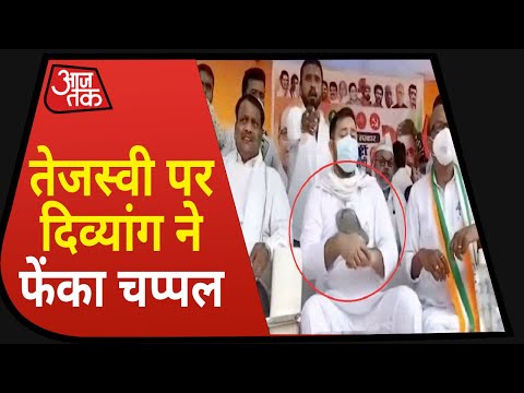 Bihar Election: Aurangabad में जनसभा में Tejshwi पर दिव्यांग ने फेंकी चप्पल, चूका तो दूसरी उछाली
